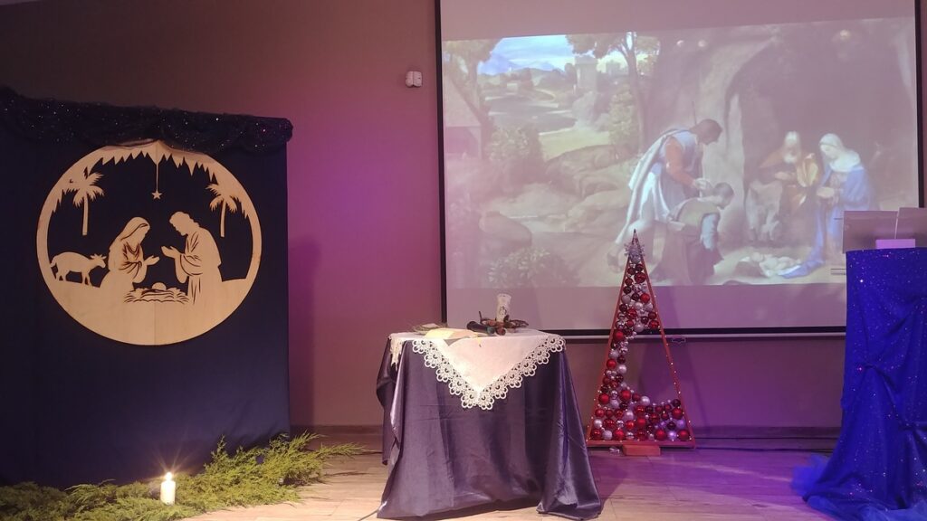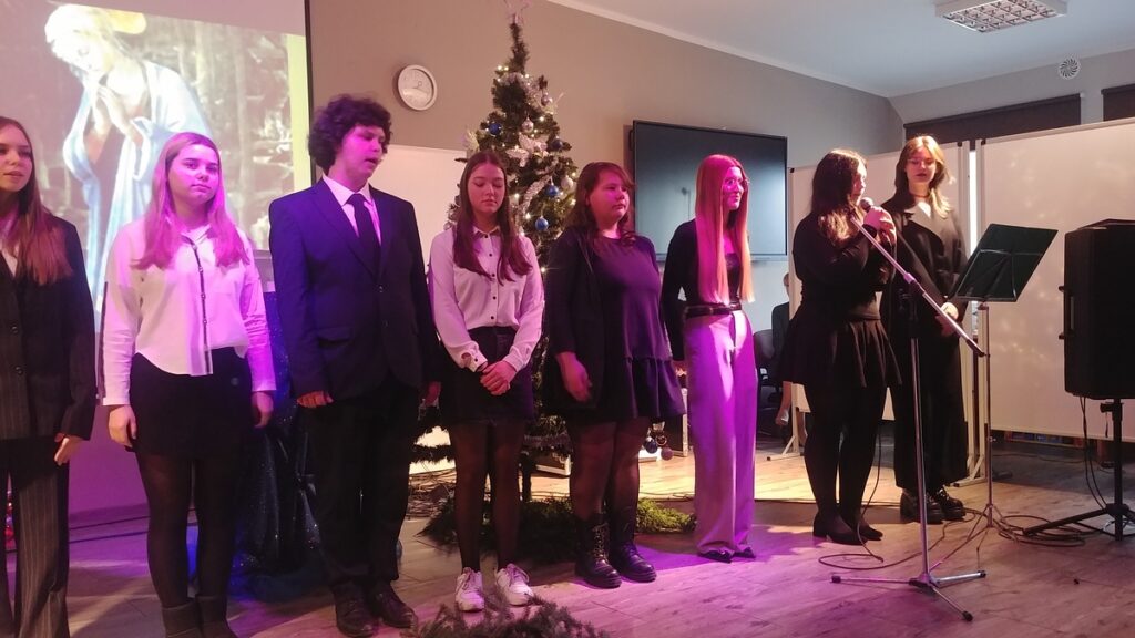 Szczególnym momentem spotkania było Misterium Bożonarodzeniowe przygotowane przez młodzież ZST w Lipnie. Przedstawienie przybliżyło uczestnikom tajemnicę Narodzenia Bożego, wydarzenia, które co roku powraca jako noc cicha, pełna światła i nadziei. To noc, w której Słowo stało się Ciałem, a historia świata spotkała się z tajemnicą wieczności. W roku 2025 społeczność szkolna spojrzała na tę tajemnicę oczami polskiej duszy, wsłuchując się w głos wielkich poetów i wieszczów narodowych, potrafiących łączyć to, co ziemskie, z tym, co Boże. W ich wierszach wiara splata się z tęsknota za wolnością, cierpienie z nadzieją, a mrok dziejów rozjaśnia blask betlejemskiej gwiazdy. Słowa Ernesta Brylla, Czesława Miłosza, Adama Asnyka, ks. Jana Twardowskiego, Jana Kasprowicza, Cypriana Kamila Norwida oraz innych wybitnych twórców prowadziły uczestników wigilijnego spotkania ku stajence, tej prawdziwej i tej symbolicznej, od wieków obecnej w sercu polskiego narodu.